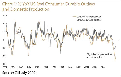 We hear every day from someone about the likelihood of a non-“V”- shaped economic recovery. After all, although every economic downturn sees companies curtailing production and cancelling orders, this one has been almost unprecedented in its severity with large double digit collapses in industrial production in most major economies. However, the neglected story is that real demand for most goods has suffered only a fairly routine fall-off (see Chart 1). This has meant that inventories in many industries have been drawn down to an unprecedented degree. With very low inventory levels any normalisation in demand levels, caused by pent-up demand and easier credit, is likely to be an equally powerful positive stimulus to production. This is how the recovery could be “V”-shaped after all.