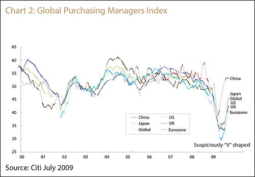 Equally Purchasing Managers Indices give a good idea not only of future economic activity – hence their strong predictive power of industrial production – but of why economies tend to recover from slumps. Managers are asked whether monthly conditions are getting better or getting worse. If conditions are no longer getting any worse, then by definition they get better. This is why PMIs tend to revert to equilibrium levels. For most Purchasing Managers business conditions won’t get any worse than December 2008 and it will not be long before the majority are experiencing less bad (i.e. better) conditions. Global PMI’s are moving back towards equilibrium (Chart 2). This means economic expansion and the end of recession. Most major economies will return to growth in the second half of 2009. This recession is ending like all of the others, in a recovery that is suspiciously “V”-shaped.