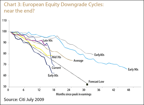 This bottoming out of economies should also mark the low-point in corporate profitability. Earnings are currently still being downgraded by analysts, although the pace of downgrades has recently slowed quite dramatically. Importantly, the earnings downgrade process over the last 18 months has already brought earnings forecasts for European equities down by 50%, which will have been the biggest profit recession in recent memory (Chart 3). From a level of corporate profitability that looked unsustainably high in 2007, European companies are now under-earning relative to their history (lower profit margins on expanded equity bases) with a forecast return on shareholders equity of 10% relative to peak profitability of 17% and a long-run average of 12%. If we are correct about the strength of the economic recovery, the current second quarter earnings season is likely to be the last to see net downgrades. When we buy equities today it is increasingly likely that we are buying trough earnings i.e. companies which are under-earning, where we can expect an earnings rebound on a normalisation of economic activity.