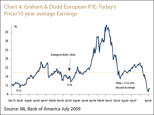 Although the European stock market is already up 30% in local currencies since March, this needs to be put into wider perspective. The overall market level is still down almost 50% from its peak and back to levels seen in 1997 (and briefly 2003). In other words, the last 12 years have been a “lost decade” for equity returns despite significant progress made by most companies in terms of sales and profits. This is best articulated by the Graham & Dodd European P/E (Chart 4) which divides today’s price by the average of the last 10 years’ earnings, which shows a P/E of 11x, a 45% discount to the long-run ex-bubble average of 20x. Moreover, on profit estimates that have already been halved, the forward P/E is back to levels last seen in the early-80’s and mid-70s when inflation and the risk-free rate (and therefore the cost of equity) was significantly higher than it is today. Buying a share of European corporate profits when companies are under-earning, the profit cycle is about to turn upwards and when valuations are at multi-decade lows would appear to be a once in a generation investment opportunity. Only an event as debilitating as the credit crunch could have caused this.