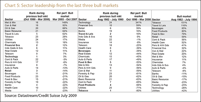 The fundamental attractions for European equities appear to be on the turn. They remain, however, the least favourite geographical subsector of the most unpopular asset class, and have seen small net redemptions year-to-date and indeed net outflows over the last 10 years. This undoubtedly has much to do with the distinct absence of a good “story”. The secular growth narratives of Chinese industrialisation, commodities, infrastructure and agriculture are wellknown and continue to endure. Yet stock-market history suggests that bear-markets only truly end when “belief” in secular growth narratives has been shattered and that new bull markets form in sectors previously denied capital and which did not participate in the previous bull-run (Chart 5). In other words, sector leadership tends to change from one bull market to the next and previous leaders often turn into laggards.