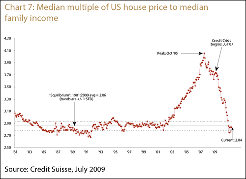 In addition, the correlation between Emerging Market equities, commodities and a weak US dollar is particularly high, which suggesting they are all part of the same successful decade-long trade. But the well-worn arguments for dollar weakness now seem stale. The US trade deficit has already come down from 6.5% of GDP in 2005 to just over 2% currently; the US personal savings rate has recovered from a negative figure to nearly 5% of disposable income; the greenback looks inexpensive relative to its history and to measures of purchasing power parity and the expensive foreign policy mistake of the Iraqi war is drawing to a close. US housing now looks cheap, with the median US house price to median family income ratio now down to 2.8x compared to a peak of 4.1x in 2005 (Chart 7). When the US economy bottoms the greenback usually rallies. Bets that rely on a permanently weak dollar look a bit passé.