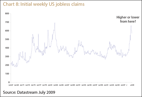 On the other hand investors seem to have forgotten the relative size and influence of the US economy. Looking at economic data series in the US it is impossible not to be struck by just how bad the current data is relative to history, to conclude that in all probability the data can only improve from here and to be excited by this recovery potential. New car sales are back to 1981 levels in absolute terms and per head of population back to where they were in 1961. New home sales are down 80% since 2005. Consumer confidence is bouncing from its worst ever levels. Initial jobless claims approaching 700k per week have been seen just once before (in 1981) since the data set began (Chart 8). The end of recession and a normalisation of the US economy will be a huge delta for the global economy and in particular for European businesses with significant North American exposure. European companies and sectors with a high level of exposure to the US have generally been stock-market laggards over the last decade. The weakness of the dollar against the Euro has been a significant drag on the European economy. The wind may be changing direction.