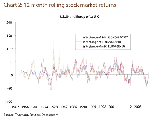 Yet by December 1975, Palmer was able with hindsight to have identified one of the greatest buying stock market opportunities of all time: “Looking back over the past 12 months, it is clear that Wall Street deserves to be described as a bull market. Up from a low of around 600, the market has regained virtually all of the ground lost during the previous year. While many missed the market bottom and maintained high liquidity through to the spring and summer the caution born of the preceding two-year slide now appears to be long gone. Most funds are now fully invested with current arguments centring on whether equities are a better investment than bonds rather than the timing of the apocalypse.”† If we look at annual stock market returns in the US, UK and Europe over the last 50 years (see below) we can see both the exceptional nature of the UK in 1975 but also that good stock market years invariably follow very poor years. Buying the market after it has fallen significantly when an economic recovery is underway has been an excellent long-term investment strategy. Underestimating the volatility of annual market returns would have been a disaster.