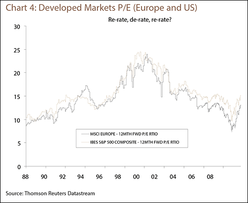If the winning combination for stock markets is “Depressed Prices + Sudden Credit Easing” then 2009 fits the formula perfectly. As we can see from the graph above, at the start of 2009 credit spreads were as wide as they had last been in the Great Depression since when they have halved giving credit investors their best ever year for returns. Even though spreads remain elevated in absolute terms, because interest rates are near to zero the cost of borrowing for many – though by no means all - companies (corporate bond yields) and individuals (mortgage rates) is at all time lows. With this considerable stimulus from credit easing, many investors have become concerned that this will lead to inflation in the price of goods and services. Others continue to worry about a Japanese style deflationary scenario. It is possibly that both are equally wrong. As Fridson has suggested, is it not more likely that this inflation is experienced first in financial assets, particularly in view of the longer term deflationary forces unleashed by globalisation? Could it be that developed market equities having suffered a decade of de-rating get re-rated in a zerointerest rate environment?