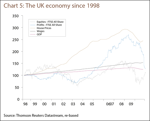 Returns from the market low in March really need to be put into some kind of longer term perspective. Even now developed market equities still trade at the same level as in 1998 and would have to rise more than 65% to get back to their 2007 (and 2000) peak. Given that share prices – with no re-rating – should only track corporate profits and corporate profits without a structural improvement in profitability can only track GDP growth, it should come as no surprise that the best time to buy equities are when share prices (and corporate profits) have underperformed trend GDP growth. Looking at the UK economy since 1998 we can see that GDP has increased by 30%, wages by 50%, house prices by 130% but that corporate profits have only risen by 25% and the equity prices have given no return.