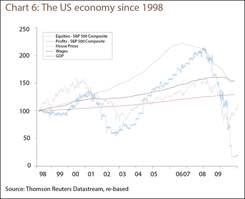 If we do the same analysis on the US economy we see that since 1998 house prices have now only risen in-line with wages (+50%). On the other hand GDP is up 30%, the stock market has delivered no return and aggregate corporate profits (including bank write-offs) have actually fallen by 80% over 11 years. Even after the 50% return from the market bottom, it has already been a lost decade for developed market equities. Should we really worry that an asset class which trades at a ten year low is overbought?