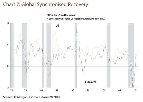 There has been a tendency in recent weeks for even some of the bulls of equity markets to see the market rally as solely a “governmentsponsored liquidity event” to the exclusion of any economic recovery or absolute value in equity markets. Although much easier for the bears to digest, a multiple expansion of financial assets in a zerointerest rate environment is really only part of the story. Leading economic indicators – as opposed to lagging ones such as unemployment – are consistent with not only all major economies having already emerged from recession but with above trend GDP growth by year-end. This is likely to be the strongest period of synchronised growth between the US and Europe since (you guessed it) 1975.