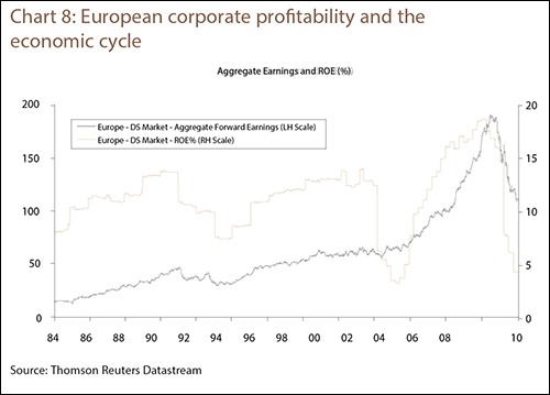 Aggregate estimated corporate profits in Europe have fallen by roughly half from their peak two years ago. Return on equity (including bank asset write-offs) has now returned to the single digit levels seen at the trough of the last economic cycle (including telecom asset write-offs). During the last quarterly reporting season (Q2) when most major economies were still in their worst post-war recessions, most European companies already reported better than expected profitability. What then should we expect to happen to profit expectations over the coming months with a “V-shaped” economic recovery on its way?