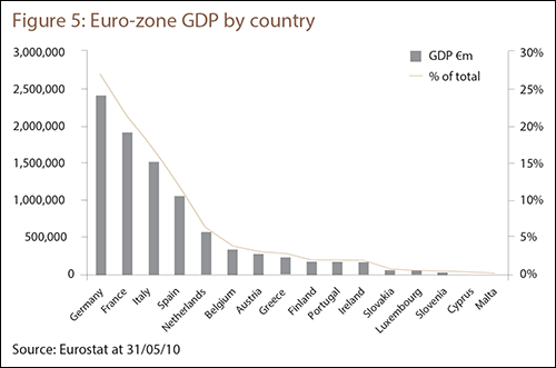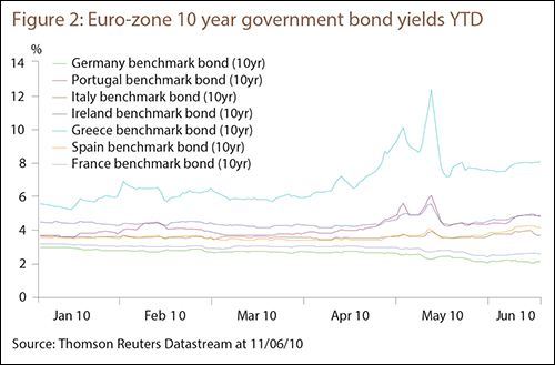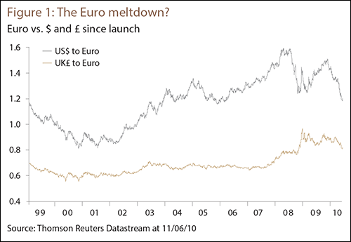 I have lost count of the number of newspaper articles over recent weeks predicting the imminent break-up of the Euro, a default by at least Greece, maybe Portugal, Ireland and Spain as well, the collapse of the European banking system and as a result, a “double dip” economic recession from which there may be no obvious way out. Often accompanied by barely concealed glee, we are told that the “melt-down” in the Euro (to levels still slightly above where the currency launched in 1999 against the US dollar and still 20% above where it launched against UK sterling (See Fig 1: “The Euro meltdown”?) is the obvious result of embarking on an economic project that was fatally flawed from inception. Moreover, with the absence of unity amongst the Euro-zone’s politicians, electorates and even its central bankers, it is argued that there is little chance of any manageable solution to the crisis. A recent Bloomberg survey showed participants view a Greek default as almost certain and the break-up of the Euro-zone as probable. Debt and disunity will bring default, double dip, deflation and depression. Further debate it seems is unnecessary, but we will try.