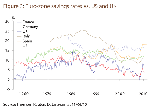 It has been noticeable that many famous money managers and market commentators – often with little explanation for their Damascene conversion – now view the Euro as a toxic asset, having only 12 months previously viewed its main rival the US dollar with similar disdain. It is worth remembering the logic behind those now slightly embarrassing but seemingly easily forgotten consensus price targets for the Euro of $1.65, even though purchasing power parity suggested that fair value was never more than $1.20. Until recently the Euro-zone has been viewed as a comparatively lightly leveraged economy. There are good reasons for this. The fiscal deficit for the Euro-zone at 6% of GDP compares with the US at 10%, Japan at 11% and the UK at 12%. The structural (economic cycle adjusted) fiscal deficit in the Euro-zone of just 3.5%, compares to 10.5% in the UK and 8.5% in the US and Japan. Euro-zone debt outstanding equates to 79% of GDP (compared to similar leverage ratios of 73% in the UK, 83% in the US and 189% in Japan.) Personal savings rates in the Euro-zone have, in contrast to the US and the UK, been double digit for decades (See Fig 3: Euro-zone savings rates vs. US and UK). The Euro-zone has a balanced current account and has no need for countries outside the single currency to fund it. Whereas the Federal Reserve and the Bank of England had to “print money”, buying assets with no balance sheet sterilisation equivalent to 8% and 12% of their GDP respectively, the ECB contented itself with providing liquidity for assets held by the banking system. There are lots of Anglo-Saxon pots here calling the Euro-zone kettle black, albeit pots with overt fiscal and political union.