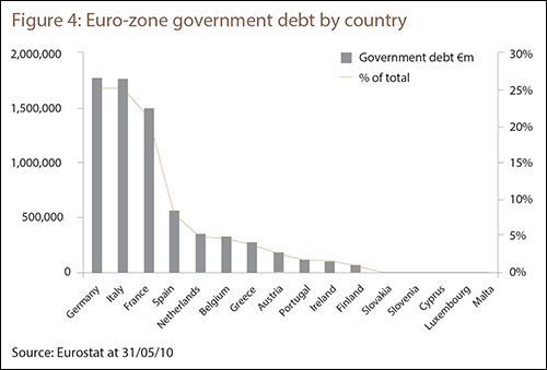 Through the announcement of the bail-out package for Greece as well as the further monies made available for other countries in the European Stabilisation Fund, Europe now has de facto fiscal unity, with the stronger countries underwriting the solvency of weaker countries. The figures announced of €110bn for Greece, and €750bn in additional aid for distressed European sovereigns, of which two thirds is funded by EU governments, one third by the IMF, are significant. For example, the total debt outstanding of the peripheral sovereigns Spain (€560bn), Portugal (€126bn), Ireland (€105bn) and Greece (€273bn) in total is €1050bn (See Fig 4: Euro-zone government debt by country), and is therefore 82% covered by the total €860bn package announced. These potentially distressed sovereigns have funding needs of just €122bn for the next two years. Any new sovereign bonds issued will have access to this funding backstop, contingent on agreement with the EU/IMF on appropriate fiscal reforms. This makes assumptions of imminent sovereign default seem far-fetched. No one is going to run out of money any time soon.