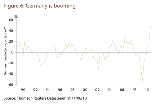 We know that fiscal austerity measures in isolation will probably have an immediate negative effect on growth, certainly in 2010 and 2011, but Spain, Portugal, Ireland and Greece account for just 16% of Eurozone GDP (See Fig 5: Euro-zone GDP by country). Without default, they are small enough not to impact the path of the growth of the wider European and global economies. They will also be reliant on growth elsewhere to pull them out of their own economic abyss. Economic growth is the biggest variable in ascertaining how solvent the peripheral countries will be over the next few years. Leading indicators currently suggest surprisingly strong growth in parts of core Europe, particularly in export led industries. With manufacturing orders in Germany (25% of Euro-zone GDP) currently running at +40% YoY (See Fig 6: Germany is booming), and the German IFO survey still running at over 100, economic growth in Europe’s largest economy is currently consistent with 3-4% economic growth, well above the 1.5% most economists are forecasting. Although extrapolating current conditions clearly is fraught with danger, we can at least say that if nothing changes estimates of economic growth in the Euro-zone (currently 1.2%) are too low rather than too high.