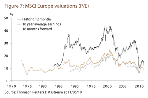 So what does this all mean for European equities? Clearly the situation is more binary than usual. A near-term sovereign default and a break-up of the Euro would be a very negative event. It is however, despite it apparently being consensus amongst investors, an improbable event, albeit one which it is logical for investors to hedge against. Record skew in the options market (puts are very expensive versus calls) suggests that they have done just this. It is therefore perhaps not surprising that market valuations seem very attractive with the forward earnings P/E ratio now in single digit and the P/E ratio using historic and 10 year average earnings estimates down to multi-decade lows (See Fig 7: MSCI Europe valuations (P/E)). On the other hand, if the crisis proves manageable then on top of cheap valuations, earnings estimates may be too low rather than too high, particularly given the weaker Euro and potential benefits from lower interest rates if passed through to credit markets. It is worth remembering the previous level of peak earnings for European markets in 2008 was an aggregate level 60% above 2010 estimated levels of profitability and this level was achieved at a currency rate against the US and the Asian dollar bloc of $1.50. Whilst higher tax rates and lower leverage will make it unlikely that European banks rapidly regain their 2008 earnings power even in a benign macro outcome, there are large parts of the European stock market that have been under-earning for a decade owing to a currency headwind. These will be the winners of the new stock market cycle.