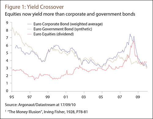 An alien with an economics degree visiting the planet for the first time may therefore find today’s popularity of bonds and the unpopularity of equities somewhat difficult to understand in view of the characteristics of money discussed above and the further quantitative easing announced by the world’s most powerful central bank. Stretched comparative valuations would further confuse the alien. It used to be considered a good buying opportunity for equities when dividend yields exceeded (10 year) government bond yields. Today, for the first time since the 1970s, European equity dividend yields not only exceed those of (10 year) government bonds, but they also exceed those of corporate bonds of the same duration (see Figure 1 “Yield Crossover”).