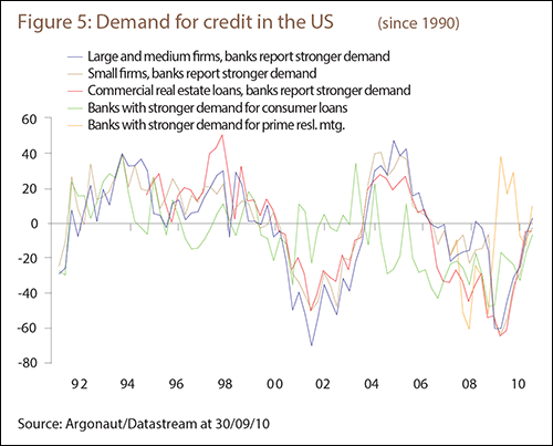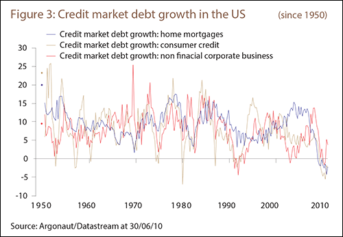 So why has there not been an increase in credit demand in the real economy despite this increase in liquidity in the banking system? The most obvious answer is that in any recession, companies and individuals become more risk adverse and prioritise paying back debt. So it is quite normal to have a “liquidity trap” in the first stages of economic recovery. It is therefore crucial to put the downturn in demand for money into some kind of historical perspective. We can see from the Fed’s “Flow of Funds” data series, which was established in 1951 (Fig 3), that home mortgage volumes contracted four quarters in a row in 2008 for the first time, having always previously maintained growth of above 4%.