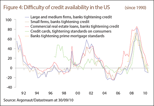 So although the transmission mechanism of quantitative easing to the real economy has to date been inefficient, it is difficult to argue that it has had no impact. After all, M1 (money in the real economy ready to be spent) has risen by $400bn over the last two years (Fig 2), which will have offset some of the deflationary pressures in the real economy. US Senior Loan Officer surveys now show the majority of respondents saying that credit is not “difficult” to obtain, having seen record “difficulty” only two years previously (Fig 4).