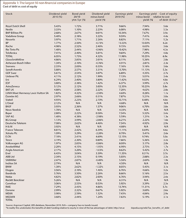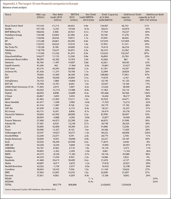 Furthermore, unlike corporate Japan in the 1990s, equity today is cheap to buy and expensive to issue. If we look back at the same largest 50 Pan-European companies (Appendix 1) we can see that the average earnings yield in 2010 is 7.5% (a P/E of 13x earnings). The financial directors of these companies will have noticed that their cost of debt (over 5 years) is on average just 2.5% in comparison. In other words, they can borrow money at a third of their implied costs of raising money through issuing new shares (2.5% versus 7.5%). There would also be a further benefit of not paying corporate tax on debt capital as opposed to equity10. They are therefore highly incentivised to borrow money cheaply to buy either the cheap equity of their own company, or of other companies.