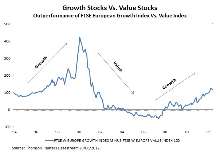 Just as the “Great Recession” of 2008 was a watershed moment in the sovereign debt markets, so it has also been in equity markets since when a new period of out-performance of “growth” stocks has begun (Figure 1). This reflects not only the higher quality earnings of “growth” stocks but also their ability to fund growth, either from cash generation or like Switzerland through preferential borrowing costs. This quiet bull market has often been hidden behind the soap opera of the Euro-zone crisis, a noisy risk-on/risk-off prevailing trading mentality and a counter-narrative of the “cheapness” of Europe’s most bombed out equities. But as the sovereign debt markets have shown, this is a new age of discernment where quality counts for more than value. And as long as “value” doesn’t work in debt markets; why should it in equities?