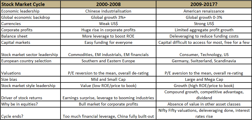 Any student of stock market history should be acutely aware that bull markets rarely repeat: every new market cycle has a different seductive narrative. When I began my career in the late 1990s it was the Technology boom. When the NASDAQ peaked in 2000 capital fled from US dollar assets into Emerging Markets funding China’s rapid industrialisation. This in turn accelerated demand for commodities and resulted in supernormal profits for commodity producers. We have long been sceptical that the new global economic cycle which began in 2009 would be a re-run of the previous Chinese Industrialisation cycle narrative7. It now seems likely that economic leadership for this cycle has moved away from EM with the US reasserting global economic hegemony through a renaissance in particular in its housing and energy sectors. This is likely to mean a structurally stronger US dollar, particularly when the main alternative, the Euro, has further work to do to convince markets of its durability. Figure 1 below shows our view of how this stock-market cycle likely compares to the previous cycle.