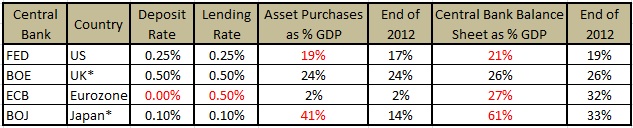 We recently wrote that we live in an age of central bank heroics. But so far it’s all talk from the ECB. As we can see from the table below whereas continued asset purchases from the Federal Reserve and those announced by the Bank of Japan have significantly increased the size of central bank balance sheets in the US and Japan since the start of the year, the balance sheet of the ECB has actually shrunk to 27% of Eurozone GDP from 32%, largely as a result of €276bn of LTRO liquidity being repaid1. Given on-going anaemic growth in the Eurozone and outright recession in southern Europe, ECB inaction to date compared with their peers is somewhat baffling.