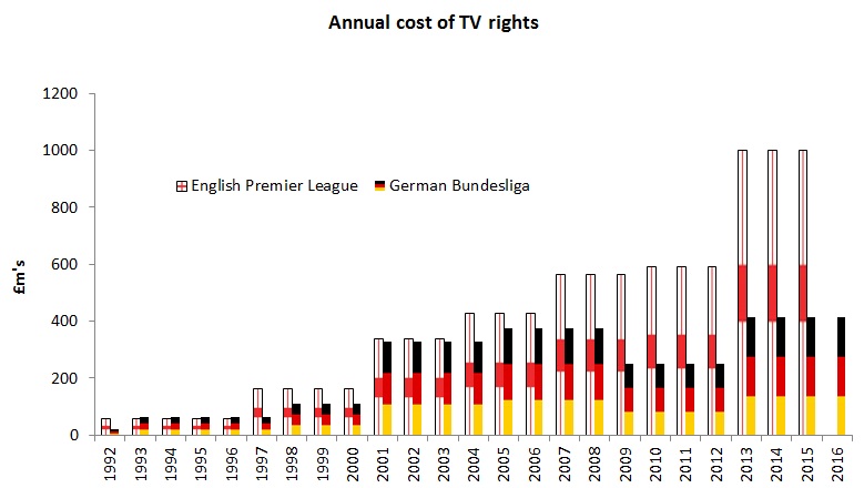 The start of the 2013/14 season will see Sky Deutschland begin a new four year contract, this time with exclusive rights to show all Bundesliga games for €1.95bn (€486bn per annum). At the same time BSKYB began a new three year contract to show 116 live English Premiership games for £2.28bn (£760m per annum) with BT also paying £738m (£246m per annum) to broadcast 38 live games. In other words the total cost of Bundesliga rights at €486bn per annum (£415m) is only 41% of the cost of the English Premiership’s rights at £1bn per annum. No one would claim that the Bundesliga is less than half as good in terms of quality.