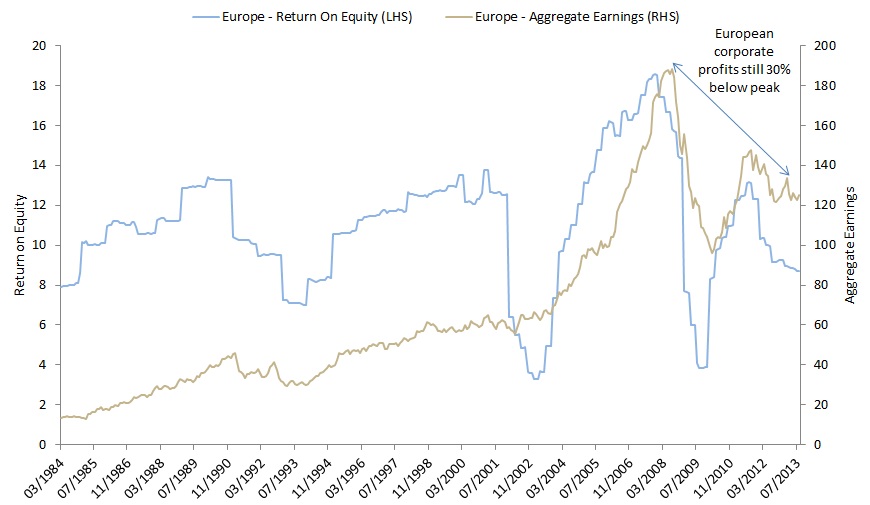 Figures released today suggest that the Eurozone emerged from a "double dip" economic recession in Q2 2013, with the second part of the “dip” having begun as far back as Q4 2011. This is consistent with the recent improvements in European macro data which if sustained will see European economic growth accelerate and European corporate profits also improve in aggregate. It is worth remembering that aggregate European corporate profits are still a third below their 2007 peak and that return on equity (ROE) at just 8.7% is below the long-term average and significantly below the 18.6% peak in 2007 as can be seen below. This illustrates the degree to which corporate Europe is still “under-earning”. An improvement back to the long-term median ROE of 11% (on the current equity base) would see European corporate profits 15% below their previous peak and the P/E multiple of the market at 10x rather than the current 12.8x. If ROE were to get back to the previous peak of 18.6% then earnings would be 43% above the previous peak (assuming the same equity base) and the P/E of the market would fall to 6x*. Although European equities have had a strong run since Draghi's OMT announcement last summer, this suggests there could be further to go if the economic recovery proves sustainable.