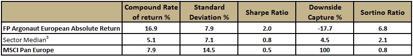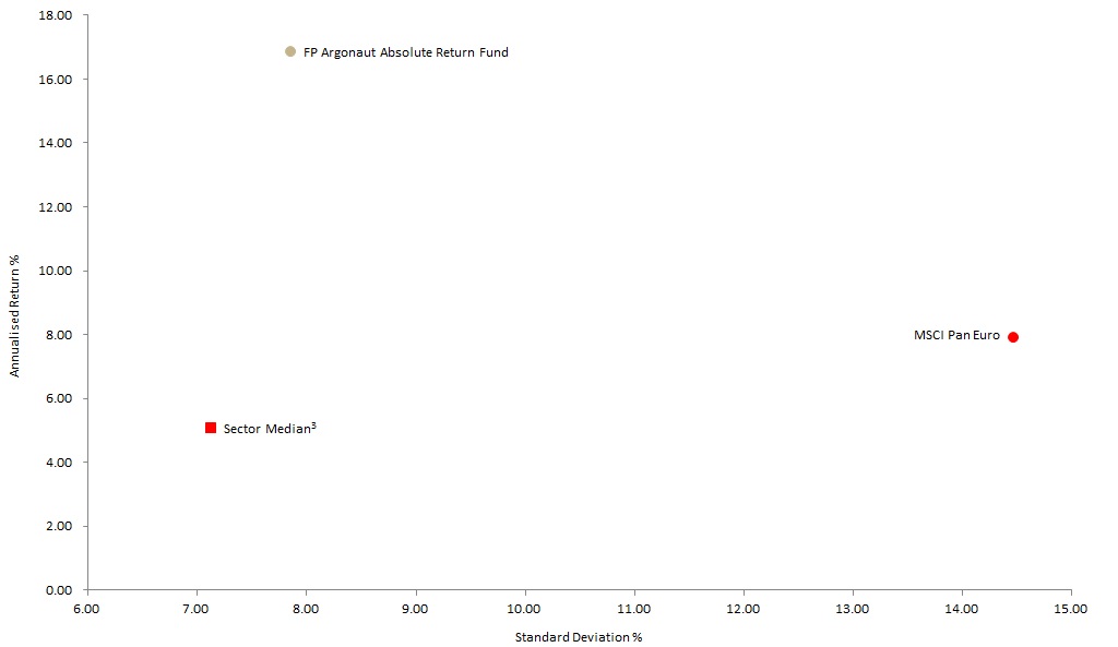 Over the last three years the Argonaut Absolute Return Fund has delivered an average annual return of 16.85% vs. the market average annual return of 7.89%. We have delivered this with a standard deviation of 7.85% vs. the market at 14.46% (by contrast the average European long short has delivered just 5.07% return with 7.12% standard deviation).2 In other words, over this time period, we have generated more than twice the market return with nearly half of the market volatility.