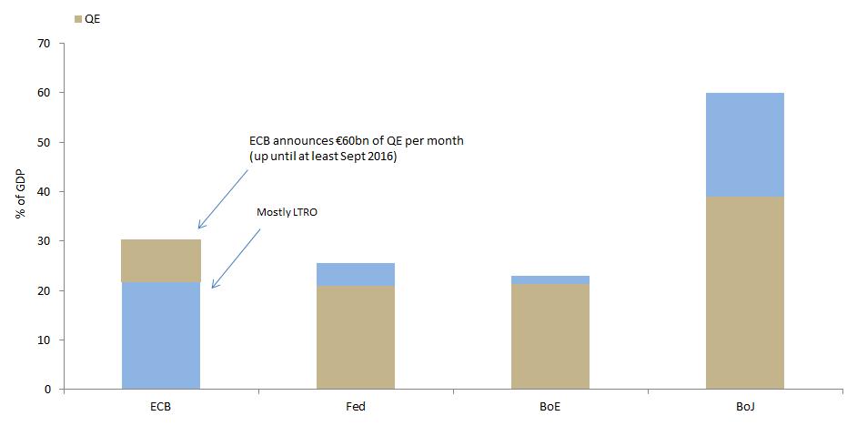 It is difficult to underemphasise the significance of ECB QE, which had previously been seen as a policy tool which the ECB could or would never implement but for which now there is essentially an open-ended commitment. As Fig. 2 illustrates, even with the c.€1trillion of asset purchases announced to September 2016, the ECB balance sheet is currently still quite modest in size (30% of GDP) compared to others, particularly when considering the other €2 trillion of assets are mostly LTRO which will come off the balance sheet as they mature.1 The advantage of sovereign as opposed to private sector QE is that it is a big, liquid market where the ECB can put a lot of capital to work as stimulus. Asset purchases announced by the ECB amount to around 7.5% of Eurozone GDP. With an estimated Eurozone fiscal deficit of just 2.2% of GDP this year, the stock of Eurozone public debt available to investors will actual decline (for the first time since WW2).2 As such, we are not only witnessing what can only be described in the context of financial history as insanely low yields on most sovereign bonds, but a likely crowding out of institutional investors from traditional fixed income markets, with liquidity inevitable ending up in other asset classes, including equity markets.