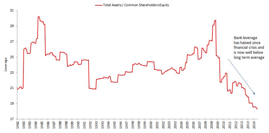 It is also worth considering that the Eurozone banking system now has minimal exposure to Greece and that the system itself in aggregate has now been through a very extensive recapitalisation. Irrespective of the record loan loss provisions that banks have taken from shareholders profit and put on their balance sheets as capital to absorb losses from bad loans, if we look at the ratio of shareholder’s equity to total assets (Fig. 4 below), we can see that bank leverage has been reduced from a level of 30 times at the peak of the crisis (interestingly a level also previously witnessed in the mid-1980s) to around 18 times today.4 Measured on this basis alone, European bank balance sheets have never (at least as far as data series go back to the early 1980s) been as strong in aggregate as they are today (although we would also note that this does not mean that individual banks do not still need to raise capital). As such the commercial banking system in aggregate should be better able to absorb financial shocks. It also means that having been run in the interests of debt holders and regulators for six years of painful deleverage, banks can now make credit more readily available to the real economy and return to growth in assets (thus improving return on equity for shareholders).