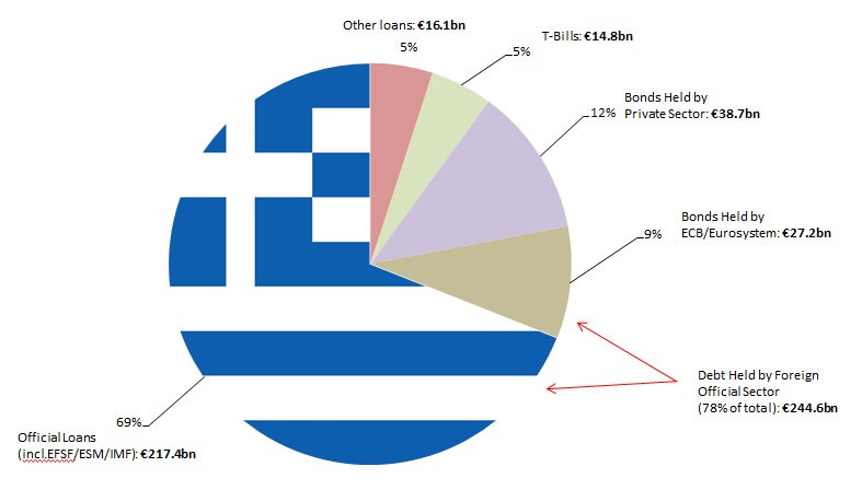 Particularly in view of the firewalls now in place for Eurozone sovereign debt, I no longer believe it is clear that the Eurozone would not be better off, certainly in the longer term, by ejecting a recalcitrant Greece from Euro membership even this leads to a short-term market negative event of Greek debt default. As we can see from Fig. 3 below, only €39bn (12%) of Greek government debt is held by private investors: the biggest amount of capital at risk (€217bn or 69% plus the €27bn or 9% held by the ECB) is largely ultimately owned by other Eurozone governments, which have record cheap access to capital, and should be put into context of the €60bn a month of new money being created by the ECB in asset purchases.3 In fact the entire stock of Greek government debt (€322bn) amounts to just over five months of ECB QE.3 These asset purchases could also be accelerated in order to shield the rest of the Eurozone economy from the negative fall-out from a “Grexit”. Although I accept it is a non-consensus view, and would fully expect an initial significant negative reaction, I think ECB QE is a “game-changer” in terms of managing the negative consequences of “Grexit”.