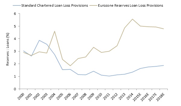 Figure 1: “Does Standard Chartered ever make bad loans?” Standard Chartered LLP/Loans vs. Eurozone bank average LLP/Loans %5