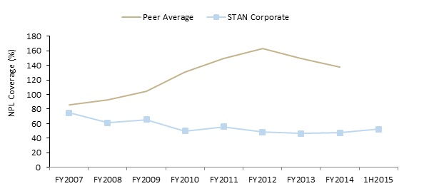 Figure 2: “Less prudent than peers?” STAN corporate NPL coverage % vs. Asian peers8