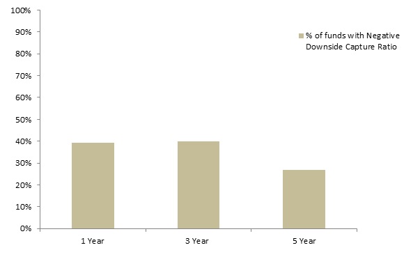 Whilst low correlation to risk-assets is desirable, rather like the Sharpe ratio with upside volatility, it is rare for investors to complain about correlation to bull markets. As such a fund’s ability to perform in negative market environments in isolation is best measured by its downside capture ratio10 with the figure illustrating the percentage of the market drawdown typically suffered by the fund and with a negative figure indicating overall an ability to generate positive returns for the fund in negative market environments. Over the past 5 years, our analysis of the Target Absolute Return sector (which must come with the caveat that the sector is also full of multi-asset and bond funds whose correlation to the European stock market should not be as high as equity based funds in any case) suggests that 30% of funds have generated a negative downside capture ratio, with this figure rising to 40% over 3 and 1 years (see Appendix 2). Only 2 funds in the sector (of which the Argonaut Absolute Return is one) since our launch have combined a downside capture ratio in excess of 10% with an annualised positive return in excess of 10% (Figure 7: “Targeted Absolute Return fund returns vs. downside capture ratio”). It is also important to point out that ability to generate positive returns in negative market months must also mean ability to generate negative returns in positive months. We are also not arguing that Absolute Return funds should derive their returns equally from negative and positive months for the stock-market as given the tendency of markets to rise over an economic cycle, this would likely lead to unattractive return profiles overall.