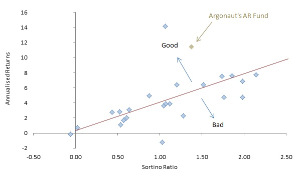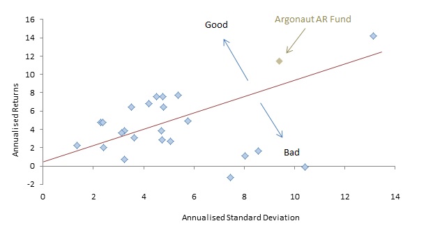 Figure 1: “Sharpe ratio analysis of Targeted Absolute Return sector” - Annualized Returns vs. Annualized Standard Deviation (since launch of Argonaut Absolute Return fund in 2009)