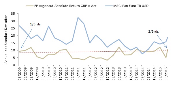 Figure 3: “Argonaut fund volatility vs. market volatility” - Annualized Standard Deviation: FP Argonaut Absolute Return vs MSCI Pan Euro