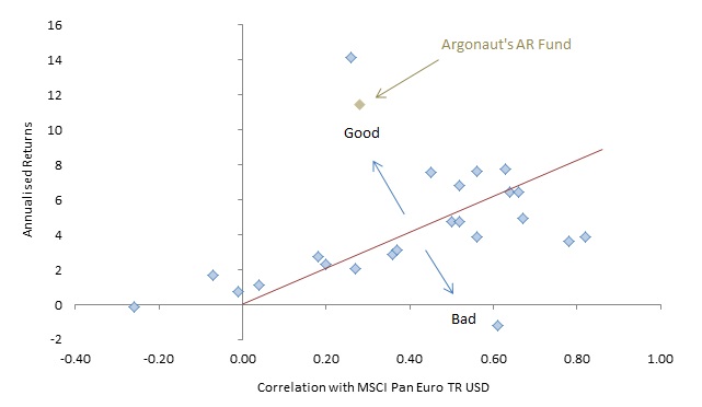 Launched in 2009, the Argonaut Absolute Return has achieved a positive return in every calendar year to date, with the price of the fund now up more than 100% since launch.1 Whilst these returns are intrinsically attractive, investing in Absolute Return should also be about delivering attractive returns combined with a risk profile which differs from traditional long only funds and therefore provides portfolio diversification.2 We think that risk profile is more than just standard deviation and that the debate around Absolute Return is overly focused on low volatility characteristics. We would point out that low volatility by itself has no portfolio diversification benefits. We are concerned that focus on low volatility in isolation can often lead to too many funds that can only deliver cash-plus returns without the safety of cash or the cost-free fee structure of cash as an asset class. Far better, we think, to view volatility as necessary to achieve a stated target return and to measure return, not just against volatility, but also against correlation to risk assets, which is far more important in constructing a diversified portfolio.