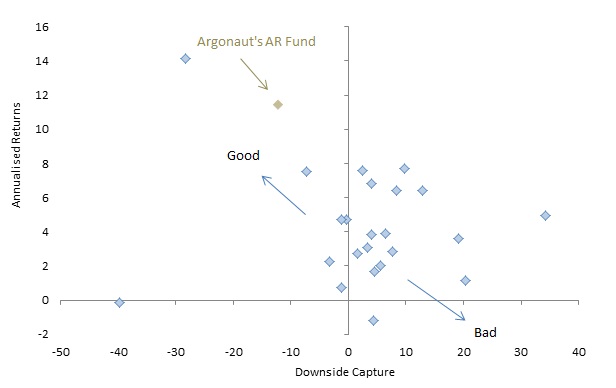 Figure 7: “Targeted Absolute Return fund returns vs. downside capture ratio” - Annualized Returns vs. Downside Capture (since 2009)