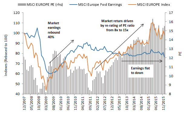 Figure 2: The European stock-market since 2008: price, earnings and valuation