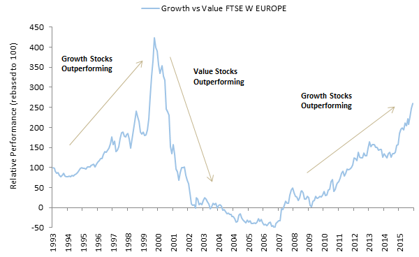 There have been an elite group of stocks which have, largely for idiosyncratic reasons, seen a bull market for their profits but in general – despite the overall upward price movement on the market - it has actually been a difficult environment for corporate profits overall. The average company has found life tough. As a consequence, the type of characteristics which “growth” investors always look for (competitive advantage, strong balance sheet, high return on equity) have been more important in this cycle than normal. By contrast, “value” investors have commonly found that “cheapness” has been based on estimates of profitability which have subsequently collapsed. Although “growth” managers will argue that the stock market always rewards “quality”, this was not the case in the previous market cycle (see Figure 3: European stock market performance: “growth” vs. “value” since 1993). The extreme outperformance of “growth” vs. “value” since the financial crisis needs to be viewed in a wider perspective of uniquely favourable circumstances which should not be expected to endure indefinitely.