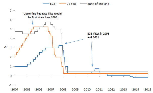 In all probability the Federal Reserve is about to embark on a rate hiking cycle (the scale and duration of which will be dependent on the recovery on main street). This would be the first tightening of US monetary policy since June 2006 (see Figure 4:“US, European and UK key central bank interest rate”). It is therefore highly symbolic and a challenge to a crude cheap money bull market. It should also be noted that the previous attempts by the ECB to raise rates in 2008 and 2011 were catalysts for a significant rise in market volatility. In all probability returns will get much harder from here: further returns from simply higher valuations would seem unlikely; “bond type equities” will likely be de-rated as bond yields rise. Of course in order for there to be a parallel shift in expectations along the interest rate curve the US economy would need to demonstrate it could tolerate both higher rates and the consequent economic fall-out elsewhere in the world (particularly Asia and other Emerging Markets) as dollar liquidity is withdrawn. As such the biggest problem for “Wall St.” may now prove to be the resilience of “Main St.”
