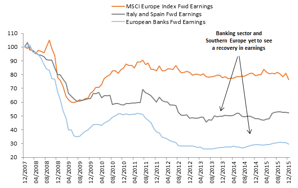We should also consider European equities in a wider perspective. The asset class having survived a near death experience with the 2011 Sovereign Crisis. It is therefore perhaps too early in Europe’s renaissance to be calling the end of the cycle, not least because much of Europe hasn’t fully recovered from the previous cycle, particularly in southern Europe and the banking sector where profits are still well below the previous peak and would seem to be in the early stages of a multi-year recovery (see Figure 5: “Southern Europe and Bank earnings vs. European aggregate earnings”). Economic data has continued to be resilient and so far relatively unscathed from the global manufacturing slowdown. The massive stimulus from depreciation of the Euro (itself a result of the different direction of US interest rates), the lower oil price, the end of bank deleveraging and continued readiness of the ECB to add further stimulus if needed offer some encouragement that the asset class as a whole may now be the least badly affected by the tightening of US monetary policy.