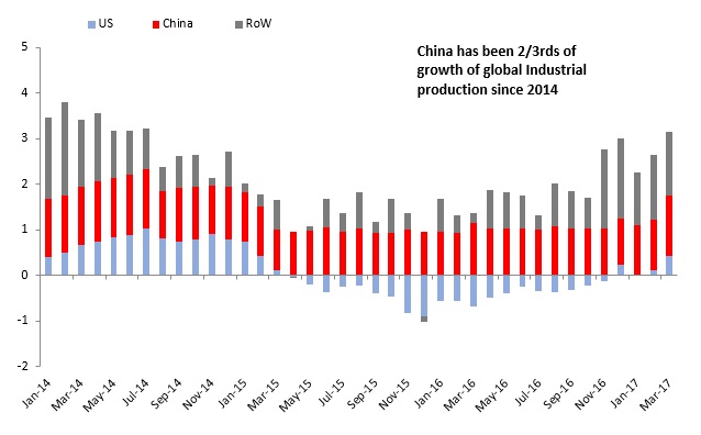 The past few weeks has witnessed typically opaque policy announcements from China on tightening monetary policy. This has immediately corresponded to falling commodity prices (as speculative positions are reduced) and the beginning of a destocking cycle in steel, as record high inventories are run down, which will hit the real demand for steel related commodities. Given the importance of China in global industrial production this, if sustained, will precipitate a global inventory destock. It is worth pointing out that since 2014, China has accounted for all the growth in global credit (See Figure 2: Contributions to Global Credit Impulse) and two-thirds of the growth in global industrial production (See Figure 3: Contributions to Global Industrial Production). Credit growth in China has recently gone into reverse. As such, the chances of a significant loss of momentum in the global economy, albeit with a lag effect, is increasing. Although European macro indicators are currently very robust, suggesting an above trend growth rate of over 2%, we should remember that Europe is traditionally late cycle and that there is little to suggest that there has been any structural pick up in long-term economic growth expectations for the continent. To adopt the old adage about the US, if China sneezes the rest of the world is likely to catch a cold, at least as far as reflation trades are concerned.