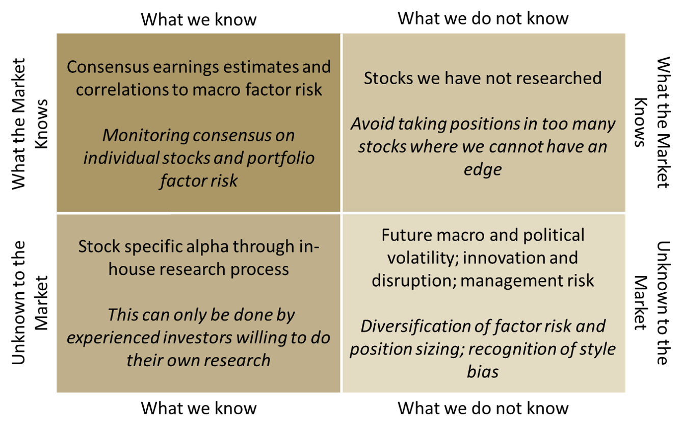 If we use Rumsfeld analysis (through a Johari window see below) to break down the risks in our investment process, we can juxtapose what we know against what the market knows in order to highlight what risks we want to take against those we wish to minimise. The risk we want to take is that which comes through our research process leading to our stock picking. We want to avoid risk that comes from the market having an informational advantage through not investing in too many positions. But it is the “unknown unknowns”, particularly future macro-economic developments, that are most difficult to monitor and manage precisely as it is impossible to fully comprehend what those risks actually are.