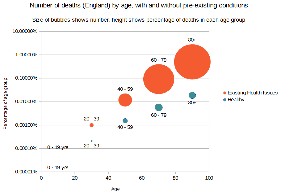 Fig 2. UK COVID deaths by age and presence of comorbidities35