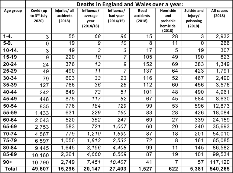 Media reporting also intentionally failed to acknowledge that mortality risk was highly skewed to age (median mortality age of 8229) in order to scare the entire population into observing lockdown with falsely exaggerated media reports of young and healthy people dying from the virus30. Mortality risk amongst the elderly was skewed to those with existing health issues (the presence of comorbidities) with Italy reporting that 96% of virus fatalities also suffered from other illnesses31, but this did not fit the desired narrative. Whereas the Spanish flu in 1918 had disproportionately killed the young and healthy32 – meaning that each death lost more years before predicted average mortality – COVID deaths on average occurred at or beyond average life expectancy33, which was always consistent with a normal mortality risk curve, and seasonal non-pandemic coronavirus34.