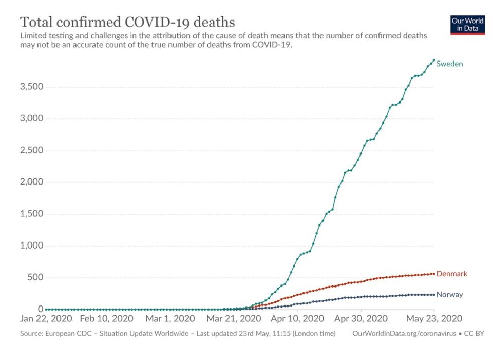 The Swedish government had been unique in recognising the trade-offs between COVID public health and other factors a rational, non-panicked, responsible government might consider and had chosen to implement social distancing but not lockdown. It therefore became a dangerous experiment which could not be reported as succeeding whatever the objective truth. Whilst even Ferguson begrudgingly accepted that Swedish mortality was a fraction (6%) of his prediction of 96,00056 deaths by June (he claimed because Sweden had in his view done a kind of phantom lockdown without telling the outside world57), other lockdown fanatics began distorting statistics by highlighting Swedish infections (Fig. 5) on a cumulative basis or comparing to other Scandinavian countries with different situations; as Sweden had a higher initial infection rate in a larger and more densely populated country, so the outcome could never be compared as a measure of success)58,59.