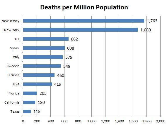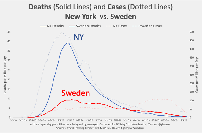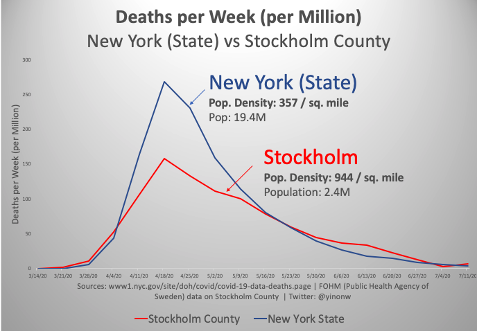 Not only did Ferguson’s lockdown model over-estimate Sweden’s deaths by a factor of 20 but Sweden also produced the same mortality and infection curve as the UK (and most other similarly urbanised European countries) and a significantly flatter infection and mortality curve than New York (Fig. 7) even comparing Stockholm with New York State (Fig. 8) (with Stockholm having over 2.5x more population density that NY State). The “shape of the curve” was unaltered by differing lockdown policy. At best the efficacy of lockdown was unproven but then there were also the unintended consequences and trade-offs that Fauci might not consider but responsible governments might . If it were a drug trial, lockdown would have been pronounced a failure and the experiment stopped.