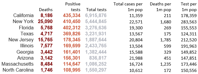 We must also note that although infections in Arizona, Florida and Texas have seen a similar spike to that witnessed in New York, the mortality remains mercifully lower to a substantial degree (90%) (Fig. 11) which can only be explained by rising testing of a younger population median (since the hospitalisation rate is also lower), better hospital treatment and an improved care home policy (at which New York and New Jersey were anomalously poor). Although we should clearly expect mortality rates to rise in the sun-belt states from very low levels, it is likely that overall mortality remains well below New York levels and beings to taper off when infections begin to peak (which according to Levitt is still a few weeks away).