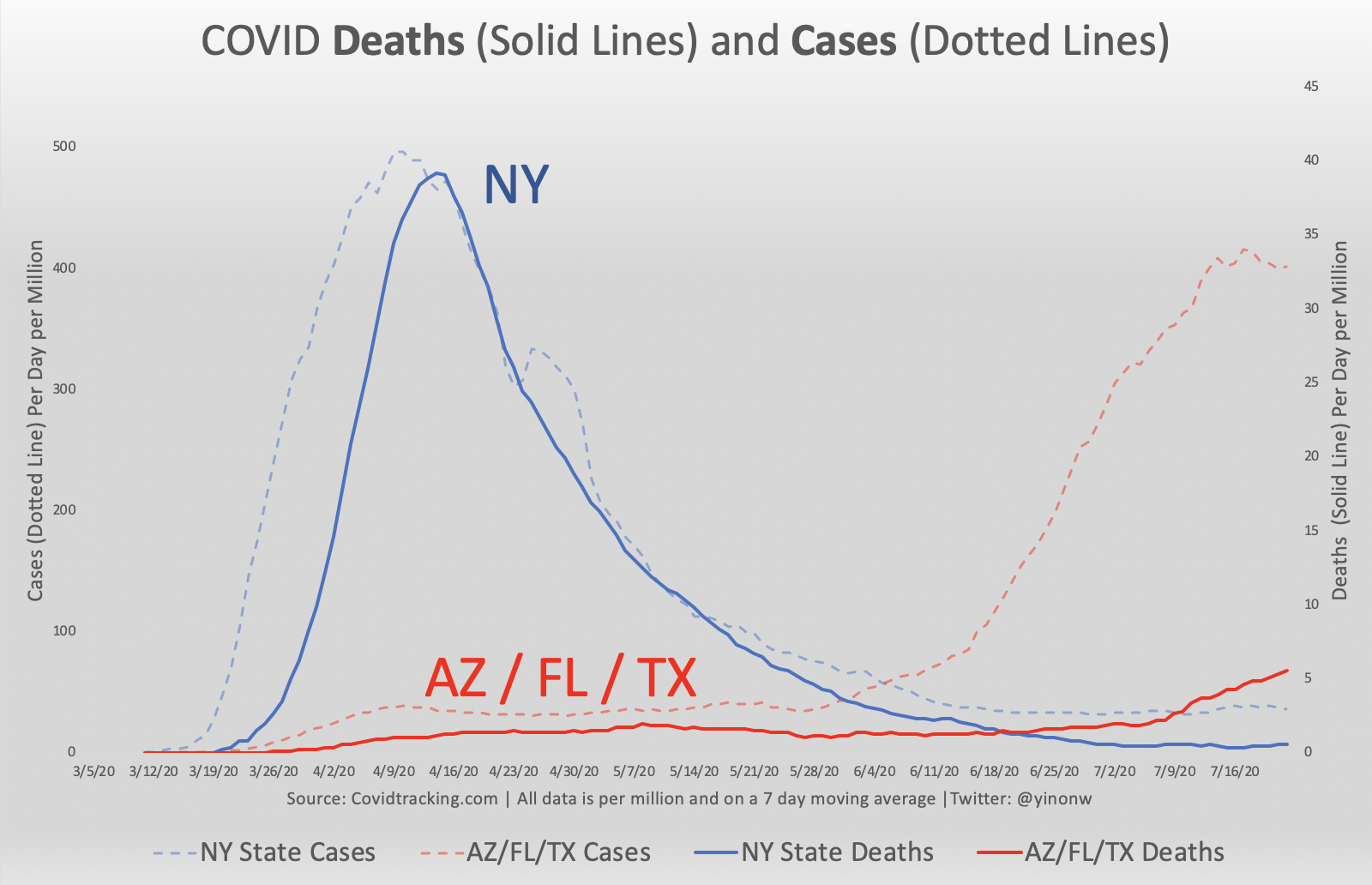 Fig 11. COVID “first wave” infection curve of AZ/FL/TX similar to New York but mortality 90% below98